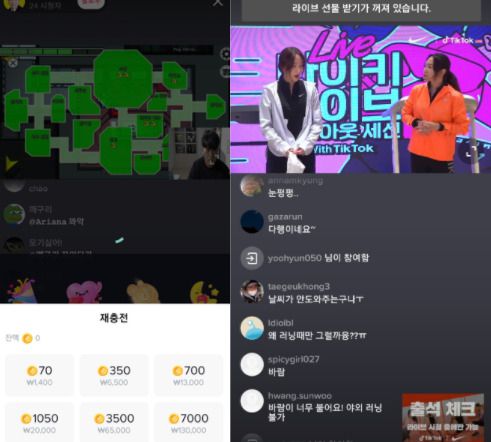 틱톡 코인 후원 화면(왼쪽), 틱톡 코인 결제 화면(오른쪽)[틱톡 캡처] |