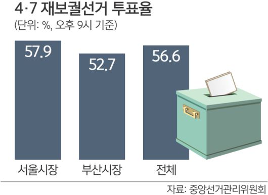오 후보는 출구조사 발표 직후 “아직 최종결과가 아니기에 소감을 말씀드리는 게 도리가 아니다”며 “기대감을 갖고 (개표를) 지켜볼 수 있도록 지지성원해주신 유권자들께 감사드린다”며 소감을 밝혔다. 울산남구청장, 경남 의령군수 등 다른 재보궐선거에서도 국민의힘 지지세가 강하게 나타났다. 이번 선거 투표율은 오후 9시 기준 56.6%로 2014년 10월 기초의원 선거(61.4%)에 이어 두 번째로 높았다. 서울은 57.9%, 부산은 52.7%였다. 서울·부산 보궐선거가 집권여당인 민주당과 제1야당인 국민의힘의 양자대결 구도로 짜이면서 양측 지지층이 결집된 데다 중도층도 대거 투표장을 찾은 결과로 해석된다.