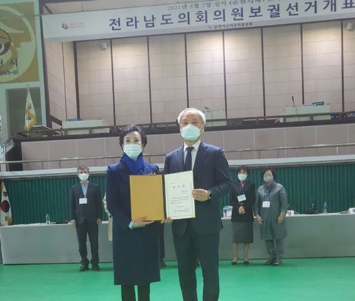 전남도의원 순천1선거구 보궐선거에서 당선된 한춘옥 후보(왼쪽)가 선관위로부터 당선증을 받고 있다. [민주당 제공] |