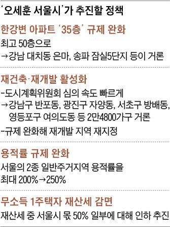 오 당선인이 대대적 변화를 예고한 부동산 정책과 관련해서도 난관이 예상된다. 재건축·재개발 규제와 용적률 완화, 재산세 감면 등을 추진하기로 했지만 상당 부분 조례 개정 사항이라 시의회 동의가 필요하다. 현재 재건축을 추진하고 있지만 서울시 도시계획위원회를 통과하지 못한 약 2만4800가구 규모 단지에 대해서도 시의원, 교수 등 위원들을 설득해야 한다. 오 당선인은 재개발·재건축의 사업성을 높이기 위한 용적률 완화를 공약했었다. 2종 일반주거지역의 경우 국토계획법상 상한 용적률이 250%이지만, 서울시는 그간 최대 200%로 묶어놓았다. 소득이 없는 1주택자에 대한 재산세 감면도 검토하겠다고 했다. 시민이 내는 재산세는 시와 해당 주택이 있는 자치구가 50%씩 가져가는데, 시가 걷는 재산세에 대해서는 감면이 가능하다는 게 오 당선인의 주장이었다. 그러나 서울시 핵심 관계자는 “박 전 시장이 만든 조직의 이름 하나를 바꾸는데도 시의회 동의가 필요한 상황이라 오 당선인으로서는 어려움이 계속될 것”이라고 했다. 오 당선인이 새로운 정책을 위해 예산 편성을 요구해도 시의회가 협조하지 않을 수도 있다. 오 당선인 측은 “시민들을 위해서는 무엇 하나도 포기할 수 없으니 끊임없이 시의원들과 소통하겠다”고 했다.
