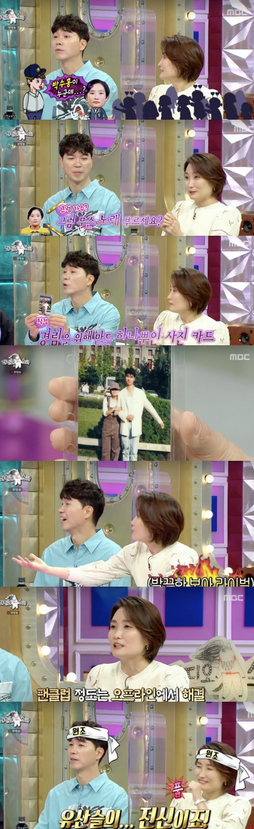 이어 그 당시 편지와 함께 하나 뿐인 함께 찍은 사진을 가져온 박경림은 “전화 번호까지 적어주셨다”며 편지를 공개했다. 특별히 박경림에게 번호를 준 이유를 묻자 박수홍은 “(팬이)유일했다”며 말해 웃음을 안겼다. 그러면서 박수홍은 “박경림이 팬클럽 초대 회장이자 마지막이었다”고 덧붙였다.