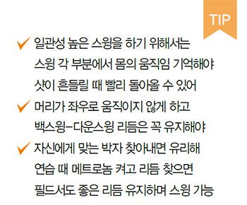 나머지 두 가지는 아주 기본입니다. 몸이 앞뒤, 위아래로 움직이지 않아야 일관성 있는 샷을 하겠죠. 배선우도 “몸의 중심을 유지하는 것은 기본 중의 기본이다. 체중 이동을 할 때 ‘머리’가 좌우로 움직이지 않도록 주의하면 최대한 몸의 중심을 유지할 수 있다”고 강조합니다. 두 번째 핵심은 ‘리듬’입니다. 늘 일정한 리듬으로 스윙을 하면 실수가 확 줄어들겠죠.
