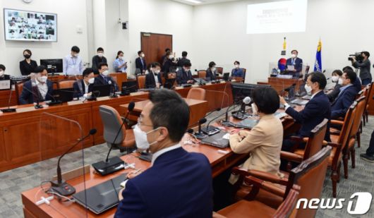 (서울=뉴스1) 신웅수 기자 = 김태년 더불어민주당 대표 직무대행이 8일 서울 여의도 국회에서 열린 화상 의원총회에서 모두발언을 하고 있다. 2021.4.8/뉴스1 |