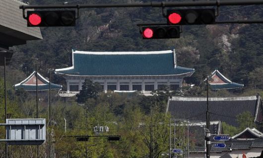 4.7 보궐선거 다음날인 8일 오전 서울시청 인근에서 바라본 청와대 방향 신호등에 적신호가 켜져있다. 뉴스1 |