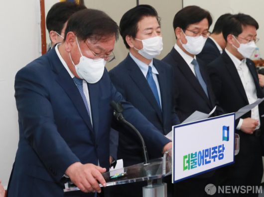 [서울=뉴스핌] 이형석 기자 = 김태년 더불어민주당 대표 직무대행 등 지도부가 8일 오후 서울 여의도 국회에서 4.7 재보궐 선거 패배에 대한 입장 발표 준비를 하며 굳은 표정을 보이고 있다. 2021.04.08 leehs@newspim.com 저작권자(c) 글로벌리더의 지름길 종합뉴스통신사 뉴스핌(Newspim), 무단 전재-재배포 금지