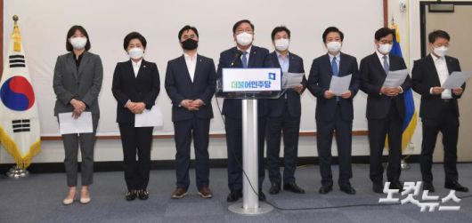 김태년 더불어민주당 대표 직무대행이 8일 오후 서울 여의도 국회에서 4.7 재보궐 선거 패배의 책임을 지고 지도부 사퇴를 발표하고 있다.