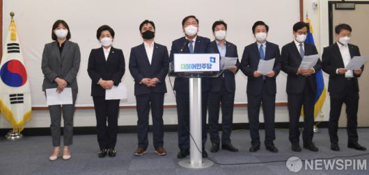 [서울=뉴스핌] 이형석 기자 = 김태년 더불어민주당 대표 직무대행이 8일 오후 서울 여의도 국회에서 4.7 재보궐 선거 패배의 책임을 지고 지도부 사퇴를 발표하고 있다. 2021.04.08 leehs@newspim.com