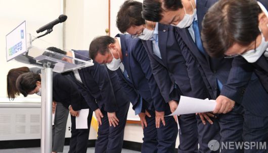 [서울=뉴스핌] 이형석 기자 = 김태년 더불어민주당 대표 직무대행과 지도부가 8일 여의도 국회에서 4.7재보궐 선거 결과에 책임을 지고 지도부가 전원 사퇴한다는 내용의 대국민 성명서를 발표한뒤 고개를 숙이고 있다. 2021.04.08 leehs@newspim.com 저작권자(c) 글로벌리더의 지름길 종합뉴스통신사 뉴스핌(Newspim), 무단 전재-재배포 금지