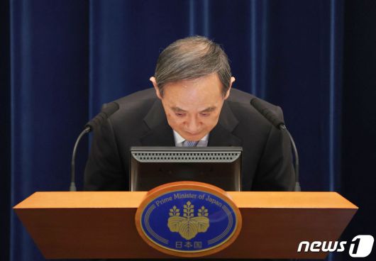 스가 요시히데 일본 총리가 18일 (현지시간) 도쿄 총리관저에서 코로나 19 관련 기자회견을 하면서 고개를 숙이고 있다. © AFP=뉴스1 © News1 우동명 기자 |