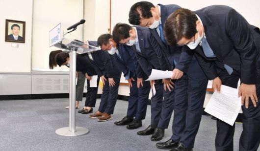 김태년 더불어민주당 대표 직무대행이 8일 서울 여의도 국회에서 4.7재보궐 선거 결과에 책임을 지고 지도부가 전원 사퇴한다는 내용의 대국민 성명서를 발표하기 앞서 고개를 숙이고 있다./사진=뉴시스 |