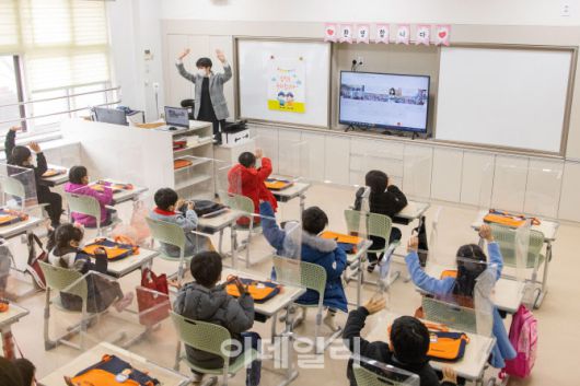 지난달 2일 오전 서울시 강남구 포이초등학교에서 첫 등교를 한 1학년 학생들이 담임교사와 함께 입학식을 하고 있다.(사진=뉴시스) |