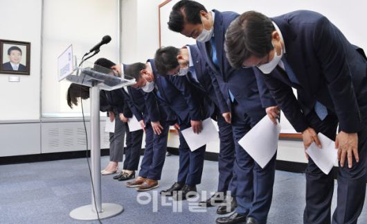 김태년 더불어민주당 대표 직무대행과 지도부가 8일 4·7재보궐 선거 참패에 따른 책임을 지고 전원 사퇴한다는 내용의 대국민 성명서를 발표한 뒤 고개를 숙이고 있다. (사진=노진환 기자) |