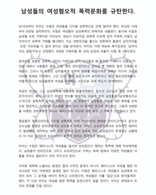 이들은 “여성의 언어는 그간 남성폭력에 대항해 만들어져왔다. 윤지선 교수님의 논문 또한 마찬가지”라며 “페미니스트가 여성의 언어를 쌓아가는 모습에 있어 남성들은 ‘남성혐오자교수’라고만 일축하며 공격을 가하고 있다”며 “이 과정에서 남성들은 여성에 대한 폭력을 오락으로 향유하고 조회수와 이슈화를 통해 다시 이 폭력은 돈으로 환산된다. 그렇게 N번방을 비롯한 성착취뿐만 아니라 페미니스트 여성에 대한 공격 그 자체가 산업화되고 있다”고 주장했다.