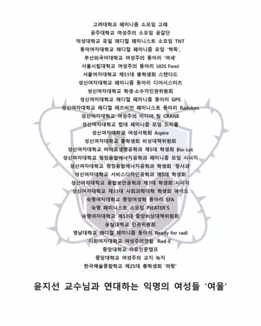 이어 “디지털 성폭력은 이제 마녀사냥의 형태로 이어지고 있다. 윤지선 교수님을 향했던 온라인에서의 성희롱과 폭력은 이제 오프라인에서의 조직적인 테러까지 발생했다”며 “재직하는 대학 정문 앞에서 성적 모욕을 하는 남성 집단이 존재하는 상황에서 더 이상 온라인과 오프라인 폭력의 경계는 존재하지 않는다. 남성들이 온라인, 오프라인으로 가하는 폭력 앞에서 지워진 여성들의 이름을 우리는 울타리가 돼 지키고자 한다”고 밝혔다.