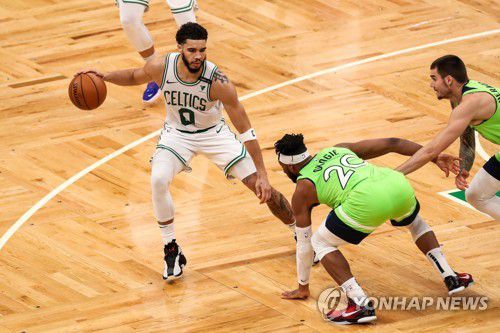 보스턴과 미네소타의 10일 경기 모습. 보스턴의 테이텀이 공격을 시도하고 있다. |