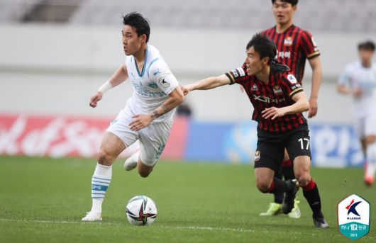 ▲ 포항 송민규(왼쪽)과 서울 김진야가 경합하는 모습.