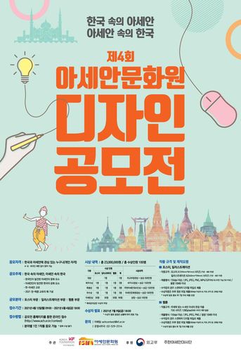 (서울=연합뉴스) 강성철 기자 = 한국국제교류재단(KF) 산하 아세안문화원은 한-아세안 간 문화교류 활동을 장려하기 위해 '한국 속의 아세안, 아세안 속의 한국'을 주제로 '제4회 디자인 공모전'을 개최한다고 12일 밝혔다.
