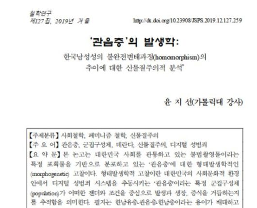 12일 본지 취재결과를 종합하면 2019년 발간된 '철학연구' 127집에 실린 윤지선 세종대 교수의 논문 ‘관음충의 발생학: 한국남성성의 불완전변태과정의 추이에 대한 신물질주의적 분석’에 학술적 결함이 발견됐다.