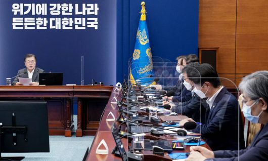 문재인 대통령이 12일 청와대 여민관에서 열린 '코로나19 대응 특별방역 점검회의'에 참석하고 있다. 연합뉴스 |