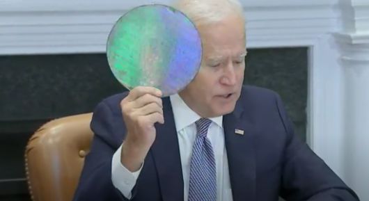 바이든 대통령은 앞서 반도체 공급망 점검 행정명령에 대해 연설하며 반도체 칩을 들고나온 데 이어 이날은 발언 중 10인치로 추정되는 웨이퍼를 들어 보이기도 했다.