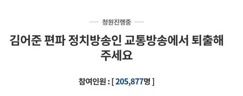청원인은 "교통방송은 청취자들이 서울시의 차량 흐름을 실시간으로 파악하도록 돕기 위해 존재하는 것"이라며 "그러나 김어준은 대놓고 특정 정당만 지지하고 반대 정당을 깎아내리며 선거와 정치에 깊숙이 관여하고 있다"고 지적했다.