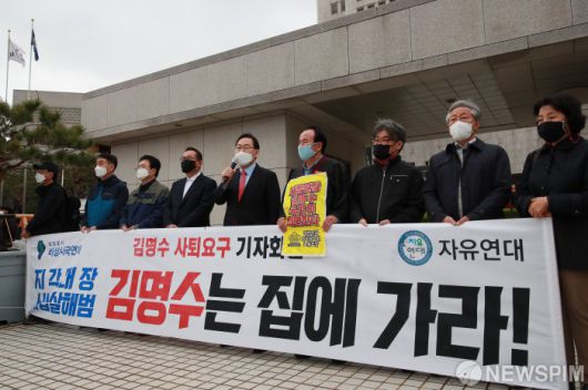 [서울=뉴스핌] 국회사진취재단 = 주호영 국민의힘 대표 권한대행이 13일 오전 서울 서초구 대법원 정문 앞에서 자유연대 주최 김명수 대법원장 사퇴 요구 기자회견에 참석해 발언을 하고 있다. 2021.04.13 photo@newspim.com 저작권자(c) 글로벌리더의 지름길 종합뉴스통신사 뉴스핌(Newspim), 무단 전재-재배포 금지