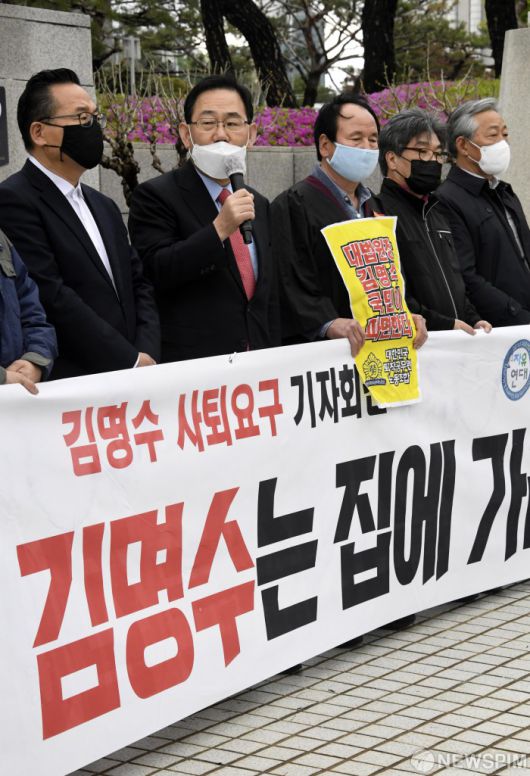 [서울=뉴스핌] 국회사진취재단 = 주호영 국민의힘 당대표 권한대행이 13일 서울 서초구 대법원 앞 ‘김명수 대법원장 퇴진 1인시위’ 현장을 방문 한 후 기자회견에서 발언을 하고 있다. 2021.04.13 photo@newspim.com 저작권자(c) 글로벌리더의 지름길 종합뉴스통신사 뉴스핌(Newspim), 무단 전재-재배포 금지