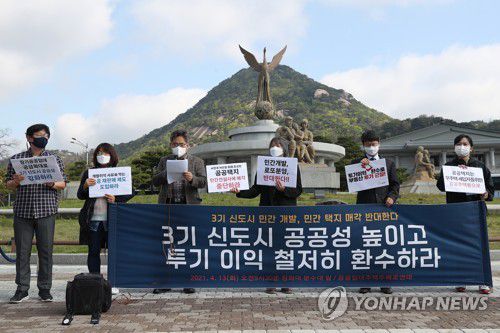 (서울=연합뉴스) 정성조 기자 = 참여연대 등 95개 시민단체로 구성된 공공임대주택두배로연대는 13일 청와대 분수대 앞에서 기자회견을 열고 한국토지주택공사(LH) 직원들의 투기 의혹이 불거진 3기 신도시의 민간 매각을 중단하고 전부를 공공주택으로 공급하라고 정부에 요구했다.