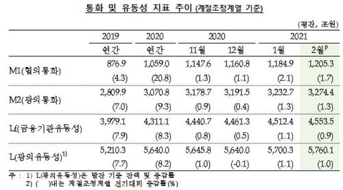 (서울=연합뉴스) 성서호 기자 = 가계와 기업의 자금 수요로 신용공급 확대가 계속되면서 올해 2월 시중 통화량이 1월에 이어 역대 최대 폭 증가를 이어갔다.