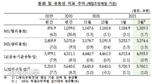 한국은행이 13일 발표한 ‘2021년 2월중 통화 및 유동성’ 통계를 보면 2월 광의 통화량(M2 기준)은 3274조4000억원으로, 1월보다 41조8000억원(1.3%) 늘었다. 2월 증가 폭은 2001년 12월 통계 편제 이후 가장 큰 규모다. 앞서 1월에도 M2 증가 폭은 역대 최대를 기록했다.