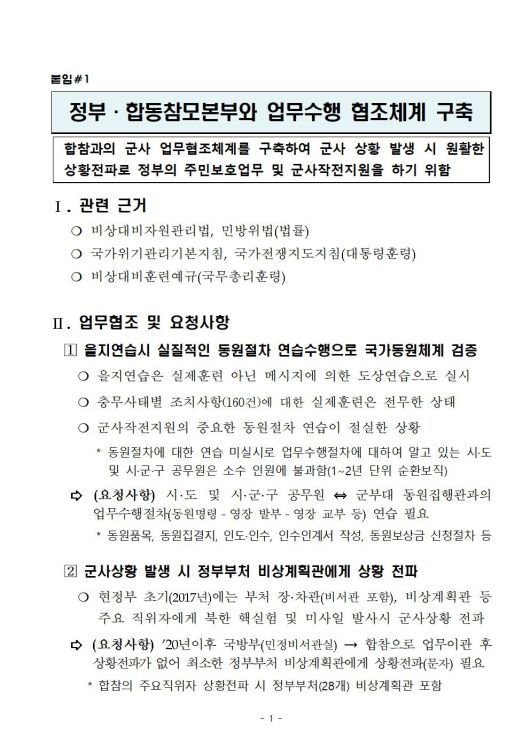 국민의힘 국방위원들은 “결국 이를 보다 못한 같은 문재인 정부 내 행안부가 국방부에 대해 ‘훈련 좀 제대로 합시다’고 항의하는 사태가 벌어졌다”고 했다. 그러면서 행안부가 지난달 24일 ’전시 상황에 대비한 실제 훈련이 필요하다’는 취지의 항의성 공문을 합동참모본부에 보내고, 합참의장 면담까지 요구한 사실을 언급했다.