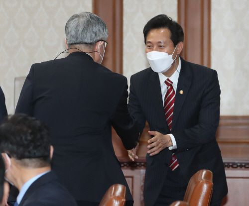 오세훈 서울시장이 13일 정부서울청사 국무회의에 참석해 장관들과 인사하고 있다. 이날 문재인 대통령 주재로 열리는 국무회의에 처음으로 참석하는 오 시장은 청와대 여민관에서 국무회의를 주재하는 문 대통령과는 대면이 아닌 화상으로 마주한다./연합 |