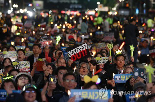 2019년 10월23일 오후 서울 서초동에서 사법적폐청산 범국민시민연대 주최로 열린 '국민 필리버스터 정경심 교수 기각 촉구 촛불집회'에 참석한 시민들이 구호를 외치고 있다. [연합뉴스 자료사진] |