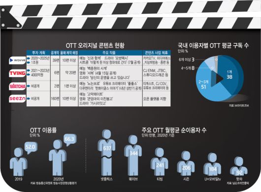온라인동영상서비스(OTT) 이용이 급증하고 있다. 방송통신위원회에 따르면 OTT 이용률은 2017년 35.0%에서 2020년 66.3%로 두 배 가까이 늘었다. 지난해 말 기준 넷플릭스 유료 구독자는 380만 계정, 웨이브는 200만 계정을 각각 돌파했다.