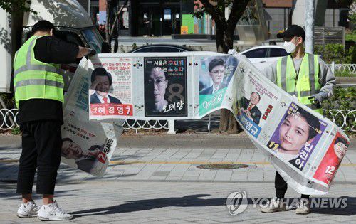 서울 송파구청 관계자들이 지난 8일 오전 송파구 잠실새내역 사거리 부근에서 4·7 재보궐선거 벽보를 철거하고 있다. [연합뉴스 자료사진] |