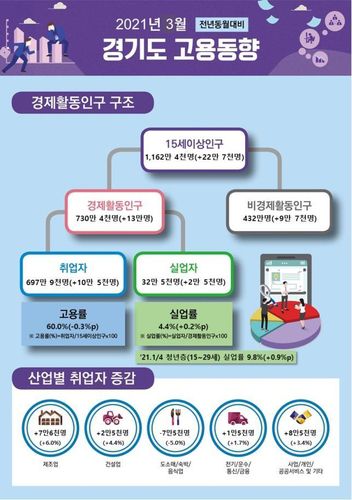 경인지방통계청이 14일 발표한 '2021년 3월 경기도 고용동향'에 보면 지난달 취업자 수는 697만9천명으로 1년 전보다 10만5천명(1.5%) 증가했다.