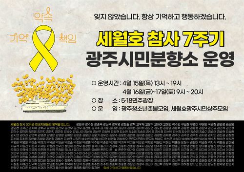 (광주=연합뉴스) 천정인 기자 = 세월호 참사를 잊지 않고 피해자를 추모하기 위한 광주 지역 분향소가 15일부터 17일까지 광주 동구 5·18 민주광장에 설치된다.
