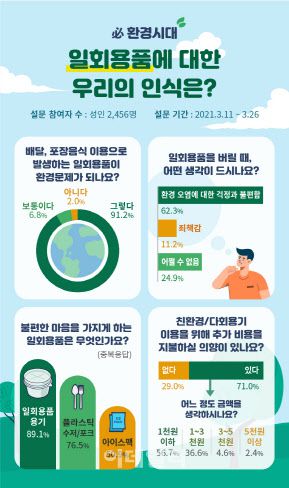 [대전=이데일리 박진환 기자] 코로나19로 음식 포장과 배달이 폭발적 증가한 가운데 대다수 소비자들이 일회용품 사용을 심각한 환경문제로 인식하고 있는 것으로 나타났다. KT CS 리서치사업팀은 ‘코로나19 이후 외부음식 이용 행태 및 일회용품 사용 관련 환경문제 인식’에 대한 온라인 설문결과를 15일 발표했다. 성인 남녀 2456명을 대상으로 실시한 이번 설문결과에 따르면 참여자의 91% 이상이 최근 크게 늘어난 일회용품 쓰레기 문제에 심각성을 느끼고 있었다.