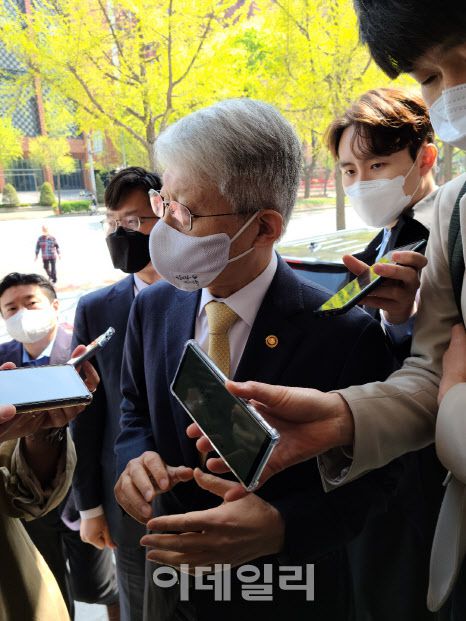 최기영 과학기술정보통신부 장관이 15일 오전 여의도 켄싱턴호텔 앞에서 기자들과 만나 질문에 답을 하고 있는 모습. 사진=노재웅 기자 |