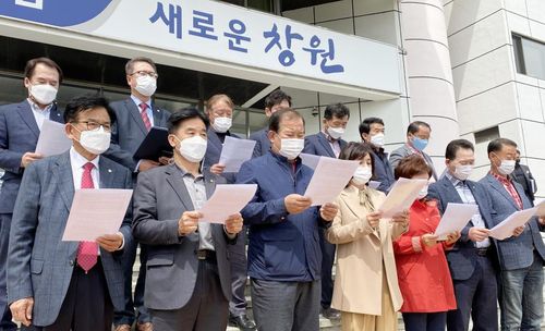 (창원=연합뉴스) 이정훈 기자 = 경남 창원시의회 국민의힘 의원단이 15일 시청 앞에서 기자회견을 열어 허성무 창원시장 재임 동안 임기제 공무원 증가 문제를 지적했다.