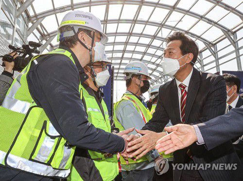 신월여의지하도로 공사 관계자와 악수하는 오세훈 서울시장 |