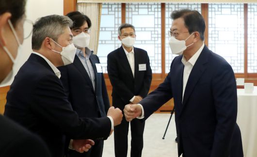 문 대통령은 권칠승 중소벤처기업부 장관에게는 “대기업들이 중소기업의 스마트화를 지원하면서 많이 돕고 있다”면서 진단키트, 마스크, 특수주사기 등의 지원 사례를 든 뒤 “중기부가 대기업의 중소기업 지원 사례를 정리해서 국민들께 알리면 앞으로 대기업이 더욱 중소기업을 보람있게 도울 것”이라고 했다.