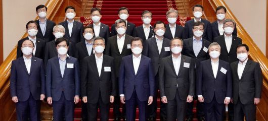 문재인 대통령이 15일 오후 청와대 본관에서 열린 확대경제장관회의를 마친후 참석자와 기념촬영을 하고 있다. 홍남기(첫줄 왼쪽부터) 경제부총리 겸 기획재정부 장관, 공영운 현대자동차 사장, 이정배 삼성전자 사장, 문 대통령, 이석희 SK하이닉스 사장, 최웅선 인팩 대표이사, 유영민 대통령 비서실장. 성윤모(둘째줄 왼쪽부터) 산업통상자원부 장관, 최기영 과학기술정보통신부 장관, 배재훈 HMM 사장, 가삼현 한국조선해양 대표이사, 정진택 삼성중공업 사장, 황호선 한국해양진흥공사 사장, 김현수 농림수산식품부 장관, 이재갑 고용부 장관. 이호승(셋째줄 왼쪽부터) 정책실장, 구윤철 국무조정실장, 문성혁 해양수산부 장관, 변창흠 국토교통부 장관, 권칠승 중소벤처기업부 장관, 은성수 금융위원장, 안일환 경제수석. /뉴시스 |