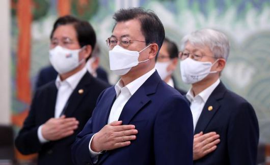 국기에 경례하는 문 대통령 (서울=연합뉴스) 최재구 기자 = 문재인 대통령이 15일 오후 청와대에서 열린 확대경제장관회의에서 국민의례를 하고 있다. 2021.4.15 jjaeck9@yna.co.kr/2021-04-15 16:03:38/ <저작권자 ⓒ 1980-2021 ㈜연합뉴스. 무단 전재 재배포 금지.> |
