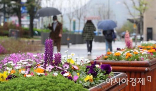 봄비가 내린 12일 서울 중구 무교동에서 우산을 쓴 시민들이 튤립 앞을 지나고 있다./김현민 기자 kimhyun81@ |