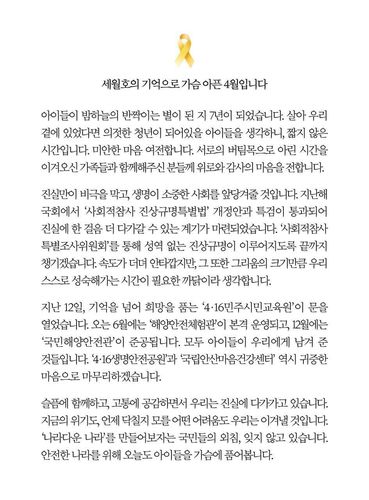 문 대통령은 "아이들이 밤하늘의 반짝이는 별이 된 지 7년이 됐다. 미안한 마음이 여전하다"며 "살아서 우리 곁에 있었다면 의젓한 청년이 됐을 아이들을 생각하니 짧지 않은 시간"이라고 돌아봤다.