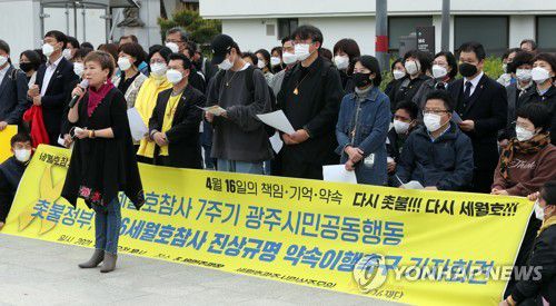 (광주=연합뉴스) 정회성 기자 = 세월호 참사 7주기를 맞아 광주 시민사회단체가 문재인 대통령에게 진상규명을 요구했다.