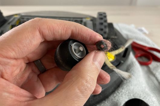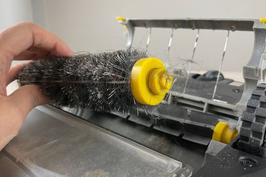 아마도 룸바를 구매하기 전에는 바닥에 이렇게 머리카락이 많은지 몰랐을 것이다. 필자 역시 청소 후에 룸바 먼지통에 쌓인 머리카락을 보며 계속 놀라곤 한다. 애완동물이 없는 데도 말이다.룸바가 바닥을 이렇게 열심히 청소한다는 점을 고려하면, 브러시에 온갖 것들이 뒤엉켜 있을 것이라고 짐작하는 것은 어렵지 않다. 다행히 룸바 브러시에 들러붙은 것을 간단하게 뗄 수 있다.