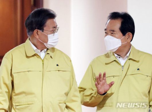 [서울=뉴시스]박영태 기자 = 문재인 대통령이 13일 오후 서울 종로구 정부서울청사에서 열린 신종 코로나바이러스 감염증(코로나19) 대응 긴급 중앙재난안전대책본부(중대본) 회의에 참석하며 정세균 총리와 대화하고 있다. 2020.12.13. since1999@newsis.com <저작권자ⓒ 공감언론 뉴시스통신사. 무단전재-재배포 금지.> /사진=뉴시스화상 |