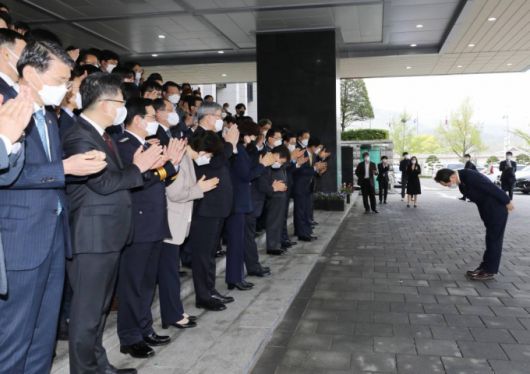 [서울=뉴시스]김명원 기자 = 정세균 국무총리가 16일 오후 서울 종로구 세종대로 정부서울청사에서 이임식을 마친 뒤 각 부처 장차관 및 직원들을 향해 고개 숙여 인사하고 있다. (공동취재사진) 2021.04.16. photo@newsis.com |